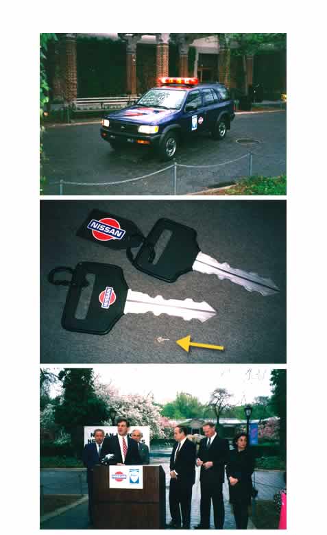 Behind the scenes For Nissan, Michael outfitted two Pathfinders as police cars, with roof lights and emblems (one vehicle is shown at top). The vehicles were presented to the NYPD at a ceremony with former NYC Mayor Rudy Giuliani and Police Commissioner Howard Safer in Central Park. Nissan also presented the Mayor with oversized Pathfinder car keys (center, shown with a real key). At the podium is Gerry Spahn, director of public relations for Nissan America (bottom). Agency partner: Shandwick USA . | ||