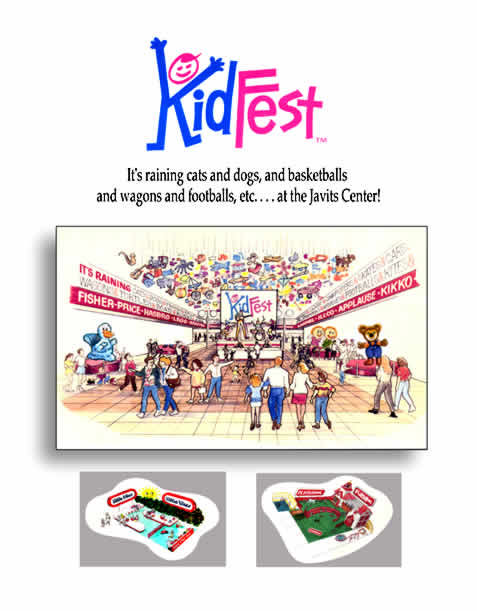 Kidfest We developed the logo and promotion concepts for KidFest, a toy "trade show" for real kids, not for business people. Children would be invited to attend the event, staged at many locations over a summer period, and play till they drop. Major toy manufacturers would have a chance to show their lines directly to "end users." We created an overall promotion theme, "It's raining cats and dogs at Kidfest." The entry arena at each event (see illustration) would be transformed with thousands of dangling toys, while guests walk beneath them. The toys would be donated by the toy makers, and given to charity at the end of the show. We developed several representative designs for interactive booths (inserts show sketches for Playskool and Little Tots), where kids could have safe and easy access to the toys and plenty of play area. Press releases urge local tv news coverage to announce, "It's raining cats and dogs at the Javits Center. Film at 11." | ||